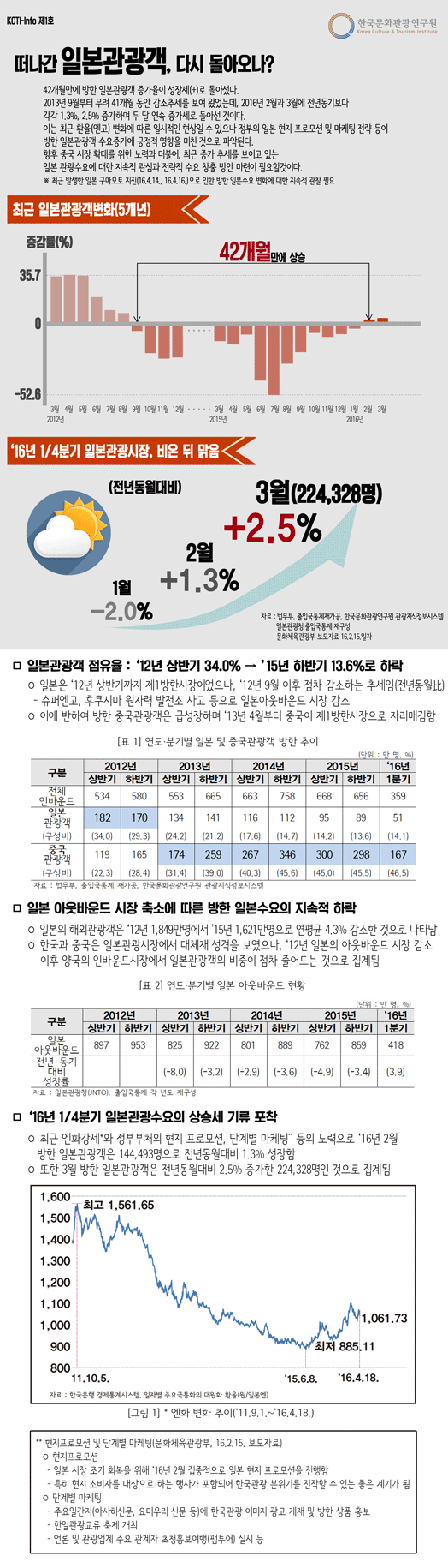 한국문화관광연구원 이(가) 창작한 [KCTI-INFO 제1호] 떠나간 일본관광객, 다시 돌아오나? 저작물은 "공공누리" 출처표시 조건에 따라 이용 할 수 있습니다.
