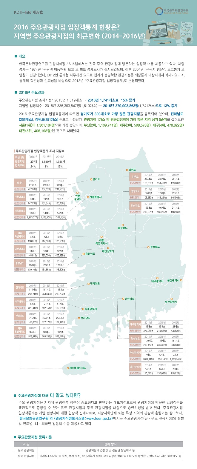 한국문화관광연구원 이(가) 창작한 [KCTI-INFO 제37호] 2016 주요관광지점 입장객 통계 현황은? 저작물은 "공공누리" 출처표시-상업적 이용금지 조건에 따라 이용 할 수 있습니다.