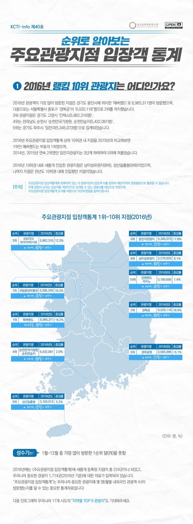 2016년 관광객이 가장 많이 방문한 주요관광지점은 경기도 용인시에 위치한 ‘에버랜드’로 6,965,311명이 방문했으며, 다음으로는 서울특별시 종로구 ‘경복궁’이 ‘6,020,118’명으로 2위를 차지했습니다. 3위 관광지점은 경기도 고양시 ‘킨텍스(5,862,316명)’, 4위는 전라남도 순천시 ‘순천만국가정원, 순천만습지(5,432,081명)’, 5위는 경기도 파주시 ‘임진각(5,345,073명)’으로 집계 되었습니다.