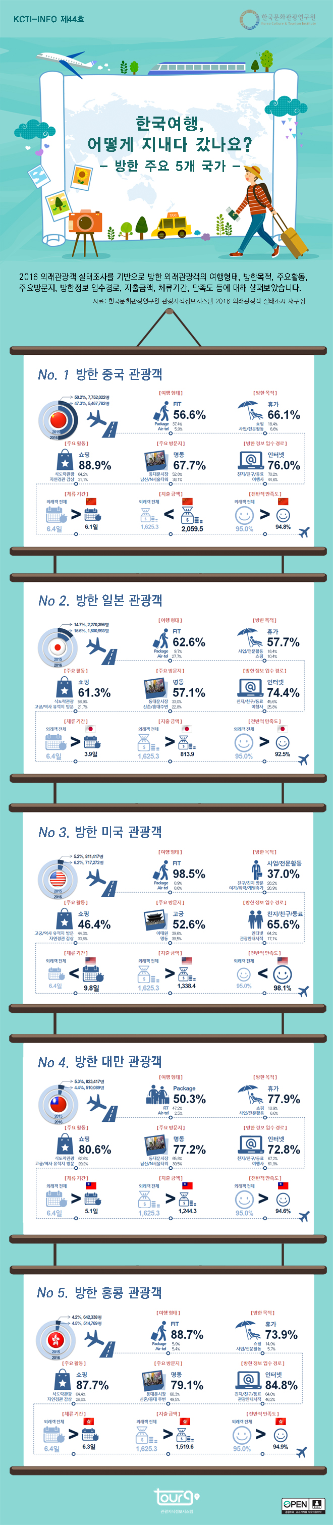 위해 한국행을 선택했으며, 주요 활동은 쇼핑(88.9%), 주요방문지는 명동(67.7%)이었으며, 지출금액은 2,059.5 USD로 평균 외래관광객 지출액에 비해 높은 편이었습니다. 오랜 단골 손님인 일본 관광객은 다른 외국인 관광객에 비해 비교적 짧게 한국에 체류했으며(3.9일),지출금액도 813.9 USD로 적은편이었습니다. 방한 제 3시장인 미국 관광객은 FIT비율이 98.5%로 높았으며, 방한 주요 목적은 사업활동(37.0%)이 높은 것으로 조사되었습니다.